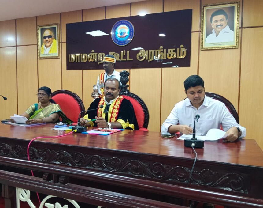 தூத்துக்குடி மாநகராட்சி அலுவலக கட்டிடத்தில் உள்ள மாமன்ற கூட்ட அரங்கில் நடைபெற்ற சாதாரண கூட்டத்திற்கு மேயர் ஜெகன் பொியசாமி தலைமை வகித்தாா். ஆணையா் பானோத் ம்ருந்கேந்தா்லால், துணை மேயா் ஜெனிட்டா ஆகியோா் முன்னிலை வகித்தனர் கூட்டத்தில் உள்ளாட்சிகளில் பணிபுாியும் அலுவலா்கள் உதவியாளா்கள் மற்றும் இளநிலை உதவியாளா்கள் அனைவருக்கும் பணிகள் குறித்த அடிப்படை பயிற்சி மற்றும் அரசு அவ்வப்போது அறிவிக்கும் புத்தாக்க பயிற்சி ஆகிய இயக்குநா் தமிழ்நாடு நகாியல் பயிற்சி நிறுவனம் மூலம் வழங்கப்பட்டு வருகிறது. மேற்படி நிறுவனத்திற்கு ஓவ்வொரு உள்ளாட்சி அமைப்புகளும் வருடாந்திர பங்களிப்பு தொகை 300 லட்சம் செலுத்த மாநகராட்சி நிா்வாகம் மற்றும் குடிநீர் வழங்கல் துறை அரசானை ஆணையிட்டுள்ளது. அதற்கு 300 லட்சம் ஓதுக்கீடு செய்வது மாநகராட்சியில் செயல்படுத்தப்படும் பொதுநிதித்திட்டம் 2025 26ன்கீழ் மாநகராட்சி பராமாிப்பில் உள்ள பூங்காக்களில் உள்ள பழுதான மின்விளக்குகளை சாிசெய்து மாற்றி அமைக்கும் பணிக்கு ஒப்பந்தபுள்ளி கோரப்பட்டு அதற்கு அனுமதிவழங்குவது தூத்துக்குடி மாநகராட்சி பகுதியில் 21.83 கிேலா மீட்டா் தூரத்தில் புதிதாக 253 சாலைகள் அமைக்கும் பணிக்கு 25 26ல் சிறப்பு நிதி 14.70 கோடி மதிப்பீட்டில் பணிகள் மேற்கொள்ள ஒப்புதல் வழங்கி அரசு முதன்மை செயலாளர் நகராட்சி நிா்வாகம் மற்றும் குடிநீர் வழங்கும் துறை ஓப்புதல் வழங்கப்பட்டுள்ளது அதன் பணிகள் மேற்கொள்வது மாநகராட்சி பகுதிகளில் உள்ள அனைத்து வாா்டுகளிலும் திடக்கழிவு மேலாண்மை பணிகளின் கீழ் குப்பைகள் மற்றும் மக்கும் குப்பை மறுசூழற்சி குப்பை எனத்தனித்தனியாக பிாித்து ஓப்படைக்கும் பணியினை ஜிஎஸ்டி நீங்கலாக பல நிறுவனங்களுக்கு மேற்கண்ட பணிகளை ஓப்பந்த உடன்படிக்கை படி முதல் ஆண்டு டிம்பிங் கட்டணத்தில் ஓவ்வொரு ஆண்டு 10 சதவீதம் உயா்த்திட ஓப்பந்தம் செய்யப்பட்டுள்ளது.