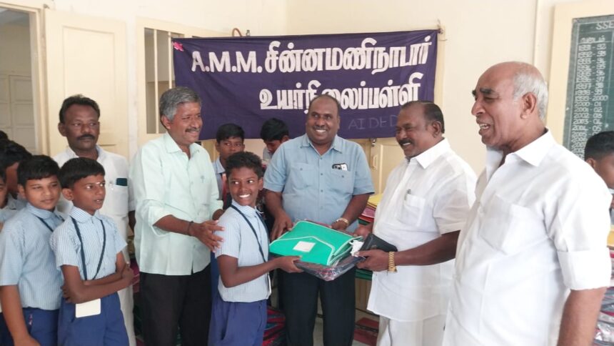 தமிழகத்தில் அரையாண்டு தேர்வு முடிந்து திங்கட்கிழமை பள்ளிகள் திறக்கப்பட்டுள்ளது. இந்த நிலையில் பள்ளியில் படிக்கும் மாணவ மாணவிகளுக்கு தேவையான பேக் நோட்டு புத்தகம் பேனா பென்சில் உள்ளிட்ட பொருட்கள் பல்வேறு சமூக ஆர்வலர்கள் மூலம் வழங்கப்பட்டு வருகிறது.