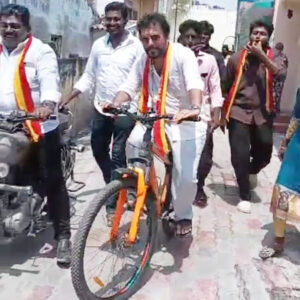 தூத்துக்குடியில் விஜய் போன்று சைக்கிளில் சென்று வீதி வீதியாக