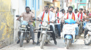 தமிழக சட்டமன்றத் தேர்தல் நடைபெற இன்னும் சில நாட்களே உள்ள நிலையில் அனைத்துக் கட்சி வேட்பாளர்களும் தீவிர தேர்தல் பிரச்சாரத்தில் ஈடுபட்டு வருகின்றனர். அதில் சில வேட்பாளர்கள் நூதன பிரச்சாரமாக ஹோட்டல்களில் பரோட்டா போடுதல், வடை, பஜ்ஜி போடுதல், அயனிங் செய்வது என பல்வேறு நூதன பிரச்சாரத்தில் பொதுமக்கள் கவனத்தை ஈர்க்கும் வகையில் தேர்தல் பிரச்சாரத்தில் ஈடுபட்டு வருகின்றன. அந்த அடிப்படையில்தமிழக வெற்றி கழகம் சார்பில் தூத்துக்குடி தொகுதியில் போட்டியிடும் நடிகர் ஸ்ரீநாத், வேட்பாளராக அறிவித்தும் தூத்துக்குடி வருகை தரும் பொழுது சுங்கச்சாவடி அருகே ஒரு ஹோட்டலில் மாஸ்டருடன் அமர்ந்து பஜ்ஜி போட்டு தனது பிரச்சாரத்தை துவக்கினார். மேலும் தூத்துக்குடி மாநகரில் பல்வேறு கட்டங்களில் தேர்தல் பிரச்சாரத்தில் ஈடுபட்டு வரும் ஸ்ரீநாத் முத்துநகர் கடற்கரை பூங்கா, போன்றவற்றில் வாக்கிங் செய்து கொண்டு காலையில் வாக்கிங் செல்லும் நபர்களிடமும் வாக்கு சேகரித்தார் அதுபோல் பொது இடங்களில் வீதி வீதியாக தீவிர பிரச்சாரம் மேற்கொண்டு வாக்கு சேகரிப்பில் ஈடுபட்டுள்ளார். இந்நிலையில்் தூத்துக்குடி முன்னாள் மாமன்ற உறுப்பினரும், தவெக பகுதி செயலாளர் ஆனந்தகுமார் ஏற்பாட்டில் நேற்று திரவியபுரம், பொன்னகரம், முத்துகிருஷ்ணாபுரம், கிருஷ்ணராஜபுரம், பார்வதிஅம்மன் கோவில்தெரு, ஆகியபகுதிகளில் பகுதி செயலாளர் ஆனந்தகுமாரின் இரண்டு சக்கர வாகனத்தில் பின் அமர்ந்து கொண்டு வேட்பாளர் ஸ்ரீநாத் வீதி வீதியாக வாக்கு சேகரித்தார். பின்னர் விஜய் ஸ்டைலில் சைக்கிளிலும் சென்று விசில் சின்னத்திற்கு வாக்கு சேகரித்தார். மாவட்ட செயலாளர் எஸ் டி ஆர் சாமுவேல்ராஜ் பகுதி செயலாளர் ஆனந்த் குமார்,பொருளாளர் சரவண்ன், வட்டசெயலாளர் நவநீதகிருஷ்ணன் உட்பட பலர் கலந்துகொண்டனர்.
