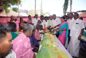தூத்துக்குடி புதிய பேருந்து நிலையம் போல்பேட்டை போத்தி விநாயகர் திருக்கோவிலில் விநாயகர் சதுர்த்தி விழா மற்றும் வருஷாபிஷேக விழா கணபதி ஹோமத்துடன் தொடங்கி சிறப்பு அலங்காரத்துடன் மஹா அபிஷேகம் நடைபெற்று பின்னர் நடைபெற்ற தீபாராதனையில் வடக்கு மாவட்ட திமுக செயலாளரும், சமூக நலன் மற்றும் மகளிர் உரிமைத்துறை அமைச்சர் கீதாஜீவன், மேயர் ஜெகன் பெரியசாமி, தா்மகா்த்தா ராஜா பொியசாமி, தொழிலதிபர் அசோக் பெரியசாமி ஆகியோர் சாமி தரிசனம் செய்தனர். பின்னர் 43 ஆண்டுகளுக்கும் மேல் கோவிலை வழிநடத்திய முன்னாள் தர்மகர்த்தாவும் எம்எல்ஏ-வும், திமுக மாவட்டச் செயலாளருமான பெரியசாமி திடலில் நடைபெற்ற அனைத்து தரப்பினரும் கலந்து கொண்ட சமபந்தி அன்னதானத்தை வடக்கு மாவட்ட திமுக செயலாளரும், சமூக நலன் மற்றும் மகளிர் உரிமைத்துறை அமைச்சர் கீதாஜீவன், மேயர் ஜெகன் பெரியசாமி ஆகியோர் தொடங்கி வைத்தனர்.