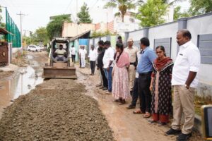 இந்த நிலையில் பிஎன்டி காலனி பகுதியில் பாதாள சாக்கடை பணிகள் நடைபெற்ற காரணத்தினால் அப்பகுதியில் மழை நீர் தேங்கியிருந்தது. அந்தப் பகுதியில் மழை நீர் முழுவதும் தற்போது அப்புறப்படுத்தப்பட்டு விட்டது. இதனை அடுத்து பொதுமக்கள் பயன்படுத்தும் சாலைகள் குண்டும் குழியுமாக காணப்பட்டது. இதனையடுத்து தற்காலிகமாக சாலையை சீரமைத்து தருமாறு பொதுமக்கள் மாநகராட்சி மேயர் ஜெகன் பெரியசாமிக்கு கோரிக்கை விடுத்தனர். உடனடியாக மாநகராட்சி மேயர் ஜெகன் பெரியசாமி அதற்கான நடவடிக்கையை மேற்கொண்டார். அதன் அடிப்படையில் பிஎன்டி காலனி 12வது தெருவில் பாதாள சாக்கடைக்கு தோண்டப்பட்ட பள்ளம் மூடப்பட்டு தற்காலிகமாக சாலை அமைக்கும் பணி துவக்கப்பட்டது. இந்த பணிகளை மாநகராட்சி மேயர் ஜெகன் பெரியசாமி, மாநகராட்சி ஆணையர் ப்ரியங்கா ஆகியோர் நேரில் சென்று நடைபெறும் பணிகளை பார்வையிட்டனர்.