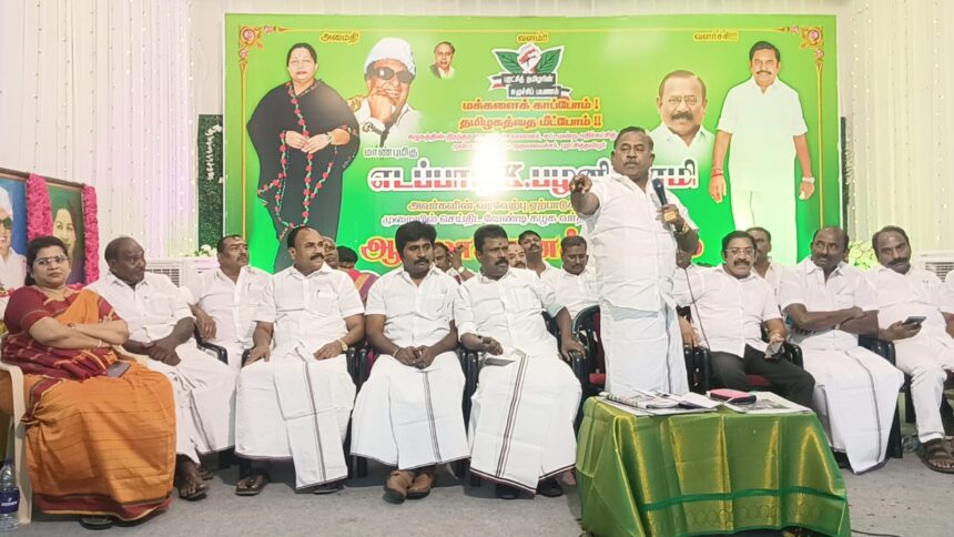தமிழகத்தில் 2026 சட்டப்பேரவை தேர்தலையொட்டி ‘மக்களை காப்போம், தமிழகத்தை மீட்போம்’ என்ற பிரச்சார சுற்றுப்பயணத்தை மேட்டுப்பாளையத்தில் அதிமுக பொதுச் செயலாளர் பழனிசாமி கடந்த 7-ம் தேதி தொடங்கினார். இந்நிலையில், 2-ம் கட்ட சுற்றுப்பயண அட்டவணையை அறிவித்துள்ளார். அதன்படி, ஜூலை 27 தொடங்கி ஆகஸ்ட் 8 வரை இரண்டாம் கட்டமாக அவர் பயனப்படவுள்ளார். “அனைத்திந்திய அண்ணா திராவிட முன்னேற்றக் கழகப் பொதுச் செயலாளரும், சட்டப்பேரவை எதிர்க்கட்சித் தலைவரும், தமிழக முன்னாள் முதல்வருமான எடப்பாடி பழனிசாமி, ‘மக்களைக் காப்போம்; தமிழகத்தை மீட்போம்’ என்ற லட்சியத்தோடு, 24.7.2025 முதல் 8.8.2025 வரை இரண்டாம் கட்டமாக, கீழ்க்கண்ட அட்டவணையில் குறிப்பிடப்பட்டுள்ளவாறு, சட்டப்பேரவைத் தொகுதி வாரியாக, தொடர் பிரச்சார சூறாவளி சுற்றுப் பயணம் மேற்கொள்ள உள்ளார். விருதுநகர், தென்காசி, திருநெல்வேலி, தூத்துக்குடி, ராமநாதபுரம், சிவகங்கை, புதுக்கோட்டை மாவட்டஙளில் அவர் சுற்றுப் பயணம் மேற்கொள்கிறார். குறிப்பாக தூத்துக்குடி மாவட்டத்தில் வரும் 31 ம் தேதி அடுத்த மாதம் 1, 2 ஆகிய 3 நாட்கள் தூத்துக்குடி மாவட்டத்தில் பிரச்சாரம் மேற்கொள்கிறாா். அவரது வருகையையொட்டி மிக பிரம்மாண்டமான உற்சாக வரவேற்பு அளிப்பது குறித்து அதிமுக வர்த்தக அணி சாா்பில் முன்னாள் அமைச்சர் சி.த. செல்லப்பாண்டியன் தலைமையில் அதிமுக நிர்வாகிகள், தொண்டர்கள் அனைவரையும் ஒருங்கிணைத்து முக்கிய ஆலோசனை கூட்டம் நடைபெற்றது. இந்த ஆலோசனை கூட்டம் தூத்துக்குடி நீதிமன்றம் எதிரே உள்ள கைலாஷ் திருமண மஹாலில் நேற்று 19 ம் தேதி சனிக்கிழமை மாலை நடைபெற்றது. இந்த முக்கிய ஆலோசனைக் கூட்டத்தில் பேசிய முன்னாள் அமைச்சரும், அதிமுக மாநில வர்த்தக அணி செயலாளருமான சி. த. செல்லப்பாண்டியன் தூத்துக்குடி மாவட்டத்திற்கு வருகை தரும் கழகப் பொதுச் செயலாளர் எடப்பாடியார் அவர்களுக்கு வரலாறு காணாத வரவேற்பு கொடுக்க வேண்டும் தூத்துக்குடி மாவட்டத்திலுள்ள 6 சட்டமன்றத் தொகுதிகளிலும் 2026 இல் அதிமுக வெற்றி அடைந்தது என்ற வெற்றிகணியை எடப்பாடியார் வசம் சமர்ப்பிப்போம் என்ற உறுதிமொழியை தற்போது அனைவரும் எடுத்துக்கொள்வோம். என்றார். அதுபோல் புரட்சித் தலைவரும், புரட்சித் தலைவியும் எந்த ஒரு இயக்கத்தை தீய சக்தி என்றார்களோ அவர்களிடம் நம்மில் ஒரு சிலர் மறைமுக உறவு வைத்துக் கொண்டு நமது இயக்கத்துக்கு துரோகம் விளைவிக்கிறார்கள் அவர்கள் ஒருபோதும் நல்லா இருக்க முடியாது அவர்கள் செய்யும் துரோகம் புரட்சித் தலைவருக்கும் புரட்சித்தலைவிக்கும் செய்யும் துரோகம் என்று ஆவேசமாக பேசினார். தூத்துக்குடி மாவட்டத்தை பொருத்தவரையில் அதிமுக கோட்டையாக விளங்க கூடிய