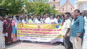 இந்த போராட்டத்திற்கு மாவட்ட தலைவர் இசக்கிமுத்து தலைமை வகித்தார். மாவட்ட செயலாளர் விஜயகுமார், மாவட்ட பொருளாளர் திரிஸ்டார் எம்.பி.பாண்டியன், மாவட்ட அமைப்பாளர் ராஜ்குமார் ஆகியோர் முன்னிலை வகித்தனர். இந்த போராட்டத்தில் மாநில பொதுச்செயலாளர் சுப்பிரமணியன், மாநில துணைத்தலைவர் பாலகிருஷ்ணன், மாவட்ட துணைத்தலைவர் குரும்பூர் சுடலைமணி, மாவட்ட துணைச் செயலாளர் உடன்குடி பொன்ராஜ் ஆகியோர் மனு கொடுக்கும் போராட்டத்தை தொடங்கி வைத்து எழுச்சியுரையாற்றினர்.